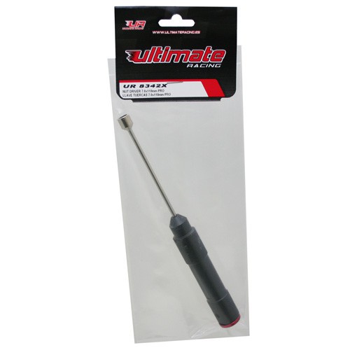Esta es la Llave de Tuercas de 7,0x100mm de Ultimate Racing. El mango de aluminio mecanizado ultra-ligero y ultra-durable se ha diseñado con una superficie rugosa para que no patine y que al mismo tiempo sea confortable al usarla durante largas sesiones de montaje y desmontaje. En el mango hay el logo de Ultimate grabado y se ha dejado un espacio libre para poder grabar tu nombre. En la parte superior hay un tapón rojo anodizado para ayudar a la herramienta a girar fácilmente en tu mano y aumentar el confort durante su uso. El grabado láser del tapón facilita la rápida identificación de cada herramienta. Las puntas de acero endurecido de larga duración e increíble par de torsión están diseñadas con precisión para que encajen perfectamente en los tornillos aumentando su vida útil