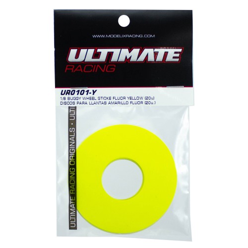 Éste es un paquete de veinte Discos Adhesivos Amarillo Fluor Ultimate Racing para llantas de 1/8 Buggy. Estas pegatinas de vinilo troqueladas de alta calidad le permiten personalizar el color de su rueda cuando lo desee. Para una fácil aplicación, el papel trasero también está cortado, por lo que solo debe despegar una parte de la pegatina, aplicarla a la llanta para centrarla perfectamente en y luego despegar la otra parte.