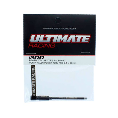Esta es la Punta Allen Power Tool Pro de 2.5 x 80mm para destornillador eléctrico de Ultimate Racing. Esta punta está fabricada en acero elástico de gran resistencia a la torsión para garantizar el máximo par de apriete en los tornillos sin roturas de puntas y un acabado de dureza superficial para disminuir el desgaste prolongando y aumentar la vida de la herramienta y los tornillos. Esta punta es compatible con la mayoría de destornilladores eléctricos del mercado. Cada punta tiene gravado en laser el nombre de la marca ULTIMATE y la medida de la herramienta para su fácil identificación.