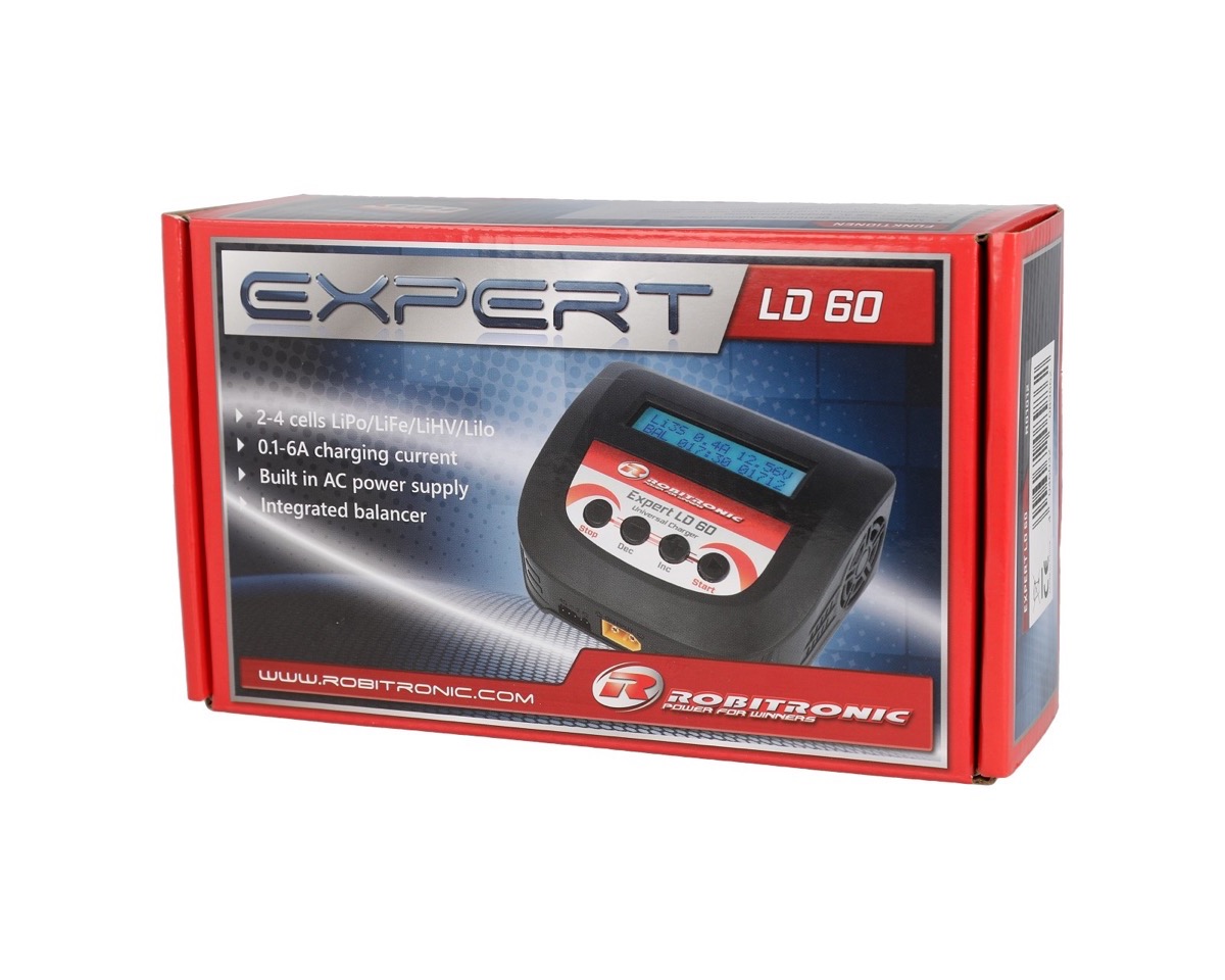 Información de producto "Robitronic Expert LD 60 Cargador LiPo 2-4s 6A 60W El cargador Expert LD 60 es un cargador/descargador multifuncional con el que puede utilizar los tipos de batería más comunes, como LiPo/LiHV/Lilon/LiFe/NiCd/NiMH/Pb.